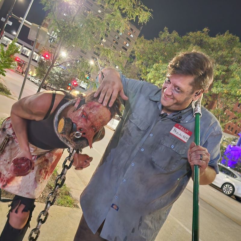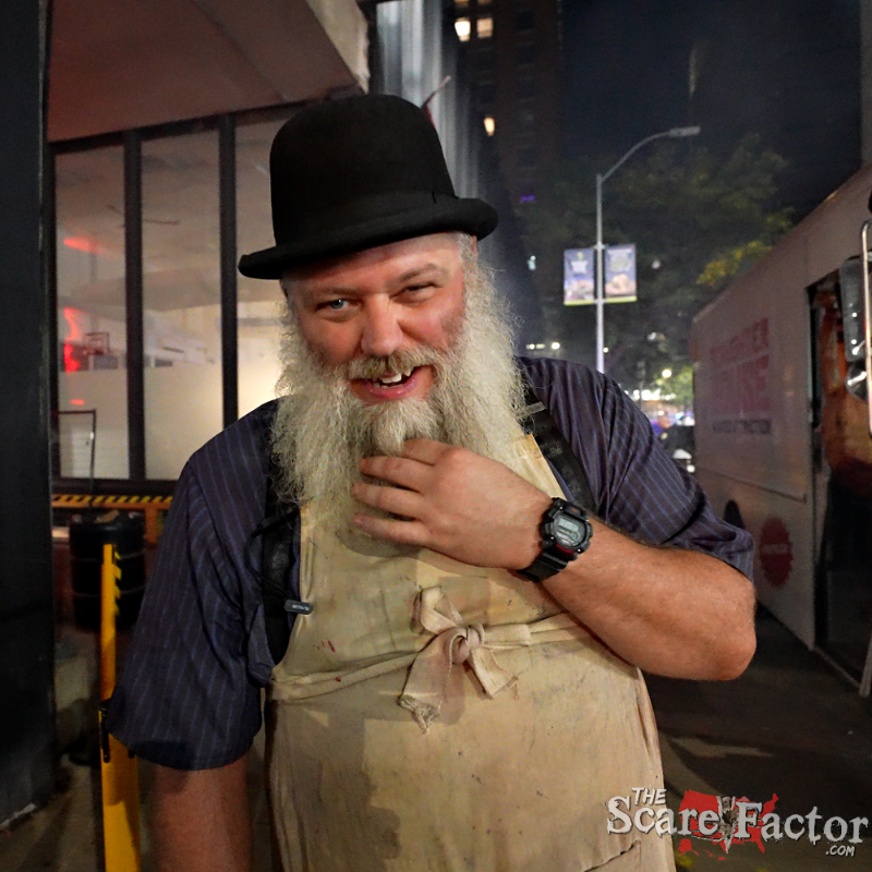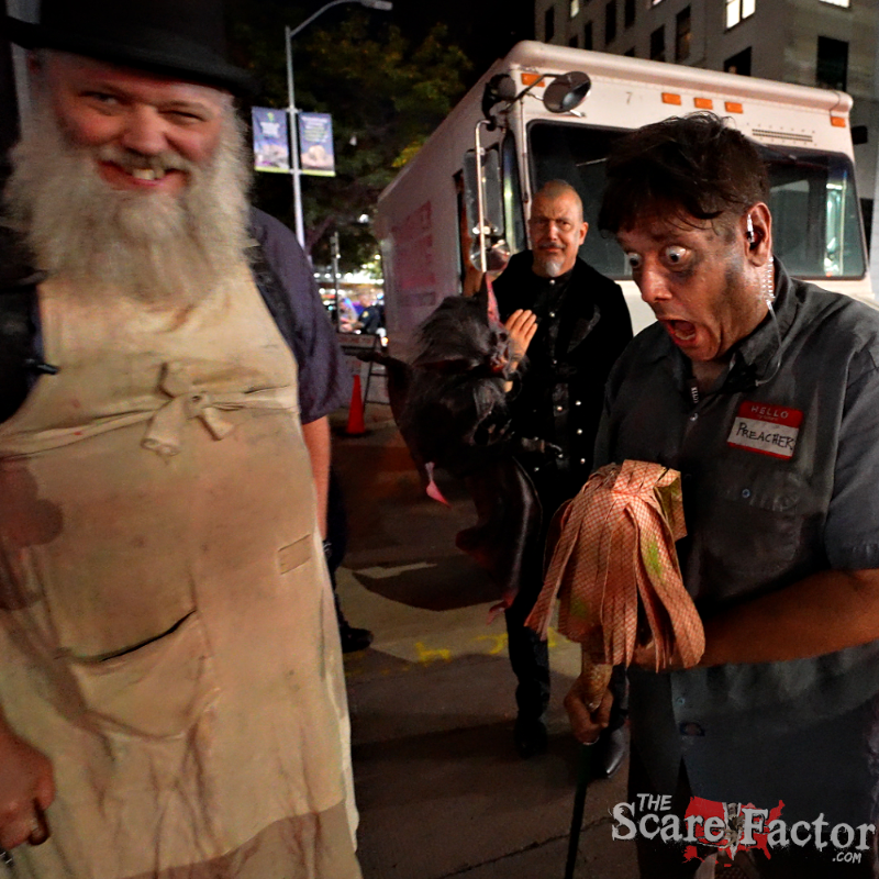 This cast was everywhere! Unpredictable, unhinged, and unbelievably interactive! They were one of the most energetic groups we’ve encountered all season. Before we could even descend into the madness below, we were ambushed by Lefty Biggs (the local legend himself), a vampire wrangler with his pet bat, Preacher, and a man frantically searching for his dog… in the business next door’s window (We genuinely feel bad for whoever has to clean those windows).