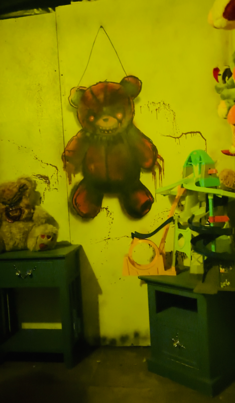 “The Clinic” began with a zombie held behind a laser light wall, whereas “Death Row” had effects to mimic a fully working furnace as well as an intense corridor of prison blocks. What’s really impressive about a lot of these mazes is that they’re clearly temporary structures and yet they feel like they have some permanence, from dolls and bears and hanging bodies in a fluorescent room, not to mention an actual toy making shop in “Toys R Undead”, to numerous different hotel rooms and a bar in “The Silence Hotel”.