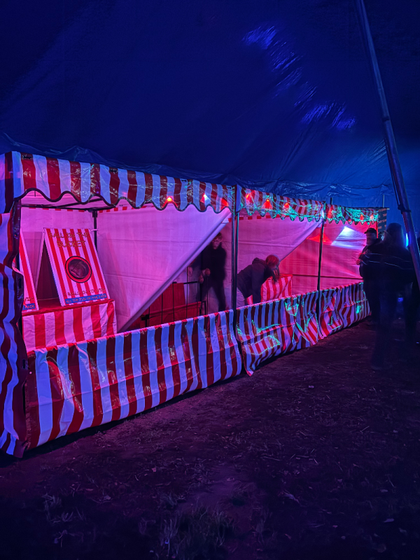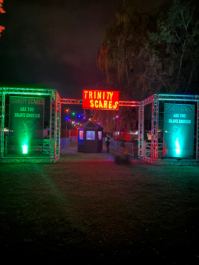 We thought the entertainment provided by the mazes was most enjoyable – these are long mazes and really make you travel the site! Outside the mazes themselves, there are some fantastic entertainments on offer. A main stage in the Big Top has acts programmed throughout the evening, in the spirit of the circus, high hoops and all. Around this, you have a mechanical pumpkin (think a bull, but this really is a pumpkin!) throwing its riders in the air, and fairground games and rides. Going beyond inclusive activities, there is “The Cave” experience, a rambling man-made caving expedition where you can climb through some very tight spaces and land in ballpit crevasses. Watch out – when we say tight, we mean tight (although one of us is 6”1’ and did just fine). With a reasonable ticket price and over 44 minutes of maze time, not to mention all the other fun you can have in an evening here, Trinity Scares is a scream you shouldn’t miss.