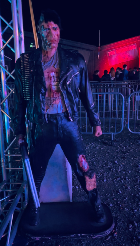 Other scenes included a Christmas grotto with fairy lights and holiday music, a big top that looked like it was being decommissioned with chairs haphazardly strewn in the corners, a twinkling fairground with rideable rides, and twitching animatronic bodies in “The Haunting”. The further we went in, the more terrors emerged from these scenes, with a man being electrocuted behind barbed wire with sound and light effects, crawling through corrugated metal, further air cannons, and an eerie room bathed in black light and fluorescent masks adorning every wall.