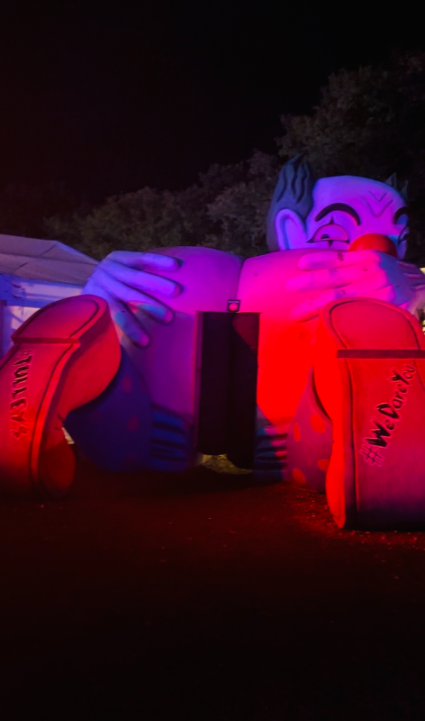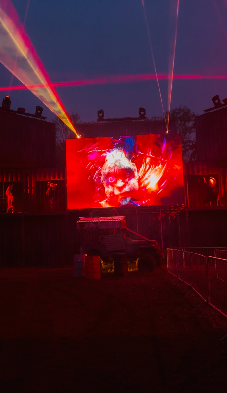 The pre-haunt areas for all the mazes are relatively strong, with the highest marks as usual going to “Wastelands Penitentiary” and the massive set design on the exterior, which is home to their infamous fire and laser show. We were also impressed with the pre-haunt areas of “Doom Town”, which is a village graveyard that gives very Haunted Mansion vibes in the best of ways, “The Carving”, with corn stalks and a giant American flag, and the automotive set pieces surrounding “Chop Shop”. Many of the other haunts, however, are much more paired back, although all have at least a bit of theming to prime you for the experience. We do think the pre-haunt area for their new maze “Glitch” could do with a bit of a rethink. The LED screen is around the corner from their queueing area, which seems a bit dead, so perhaps this could use a little rejig.