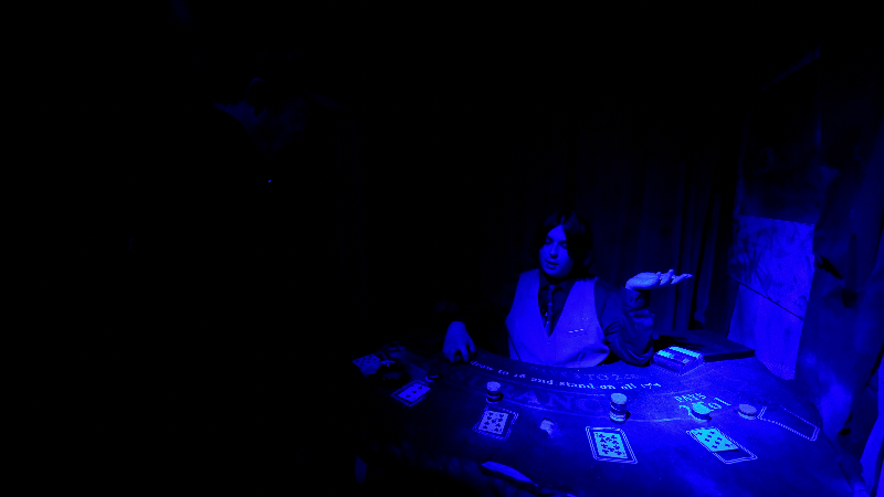 The dealer was also an incredibly interactive cast member. He asked us to pick a hand, but when we chose one, he replied that it was already taken and prompted us to pick another. Eventually, we made a choice but ended up losing. We even thought he might have set it up so we would lose automatically. Still, he was extremely entertaining and made the experience enjoyable.