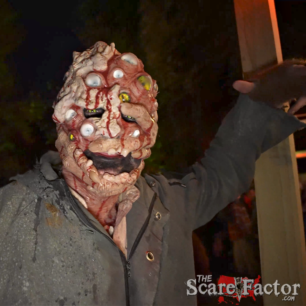 The costuming at Darkness Falls Haunted Trail was impressive! Pariah set the tone in the queue: a damaged skin mask peppered with multicolored eyes and a glowing contraption cradling a head – instant red flag. On the trail, we met a cracked-porcelain dead doll with a clown-leaning grin, clutching a gutted teddy whose “stuffing” looked suspiciously meaty. Don’t trust it! A dingy snake hunter slid up from the dark with a ball cap, flannel, work boots, and handling gloves – the whole outdoorsman kit – and later reappeared, buzzing a chainsaw.