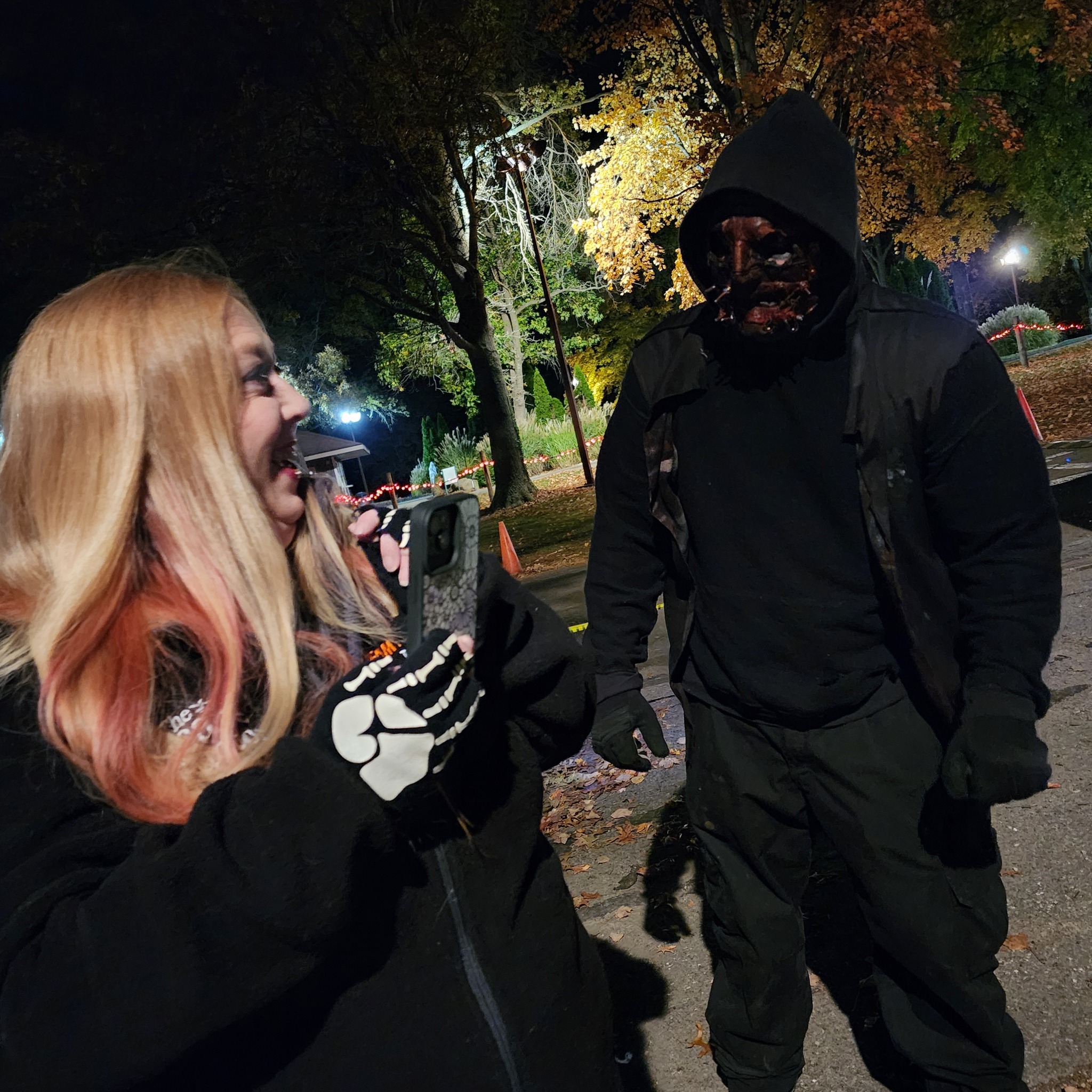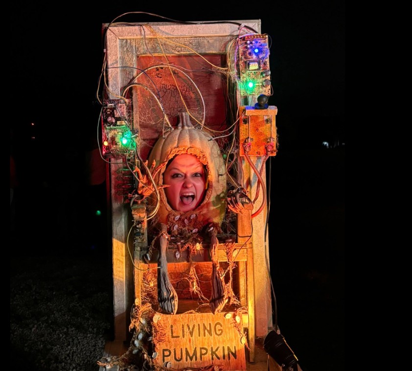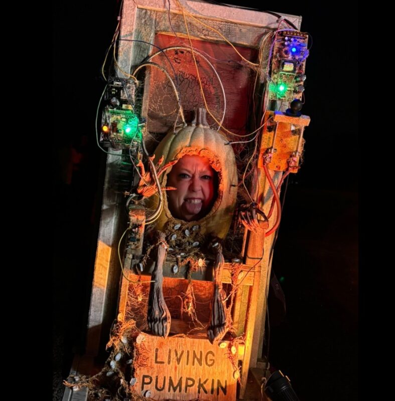 There was a fire burning in a pit near the queue and at the exit of the trail, but most cast and visitors were not taking advantage of the warmth on the evening of our visit. There were also two photo ops available right around the gift shop and snack area: a giant illuminated pumpkin and an electrified pumpkin.