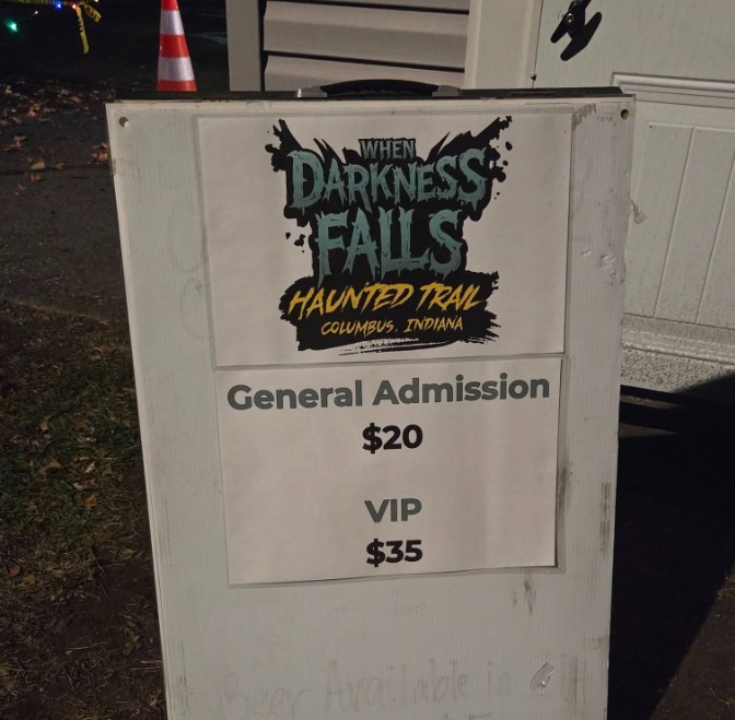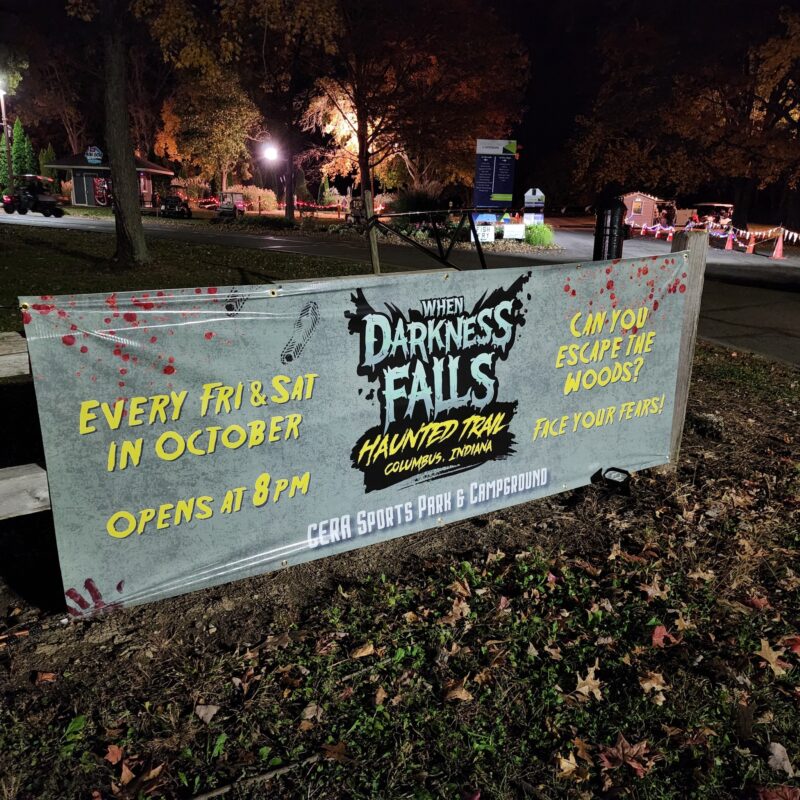 The trail is at the Cera Sports Park and Campground in beautiful Columbus, Indiana. Plenty of signage led us to the park, and the front gate confirmed where we could park for the trail. We could also follow the sound of screams and noises coming from the dark forest.