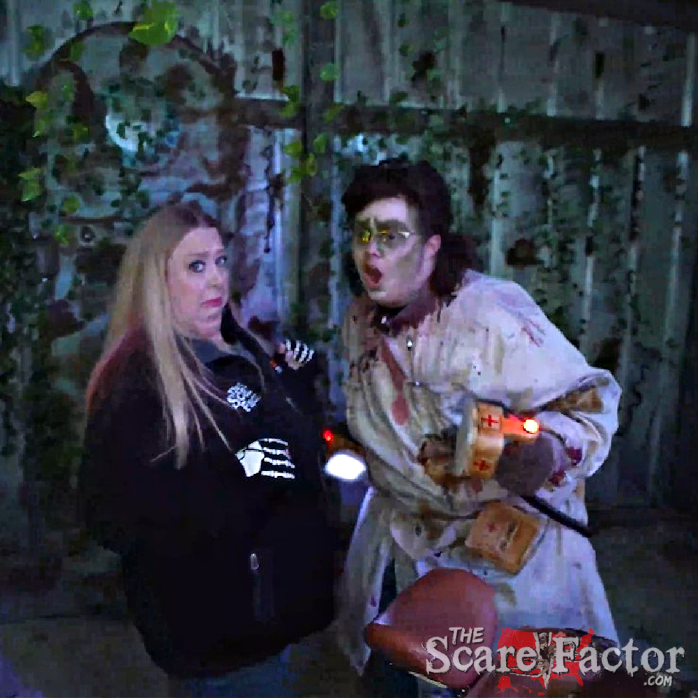 Continuing through the darkness, we were attacked by a variety of creatures and were warned about the mad scientist! Suddenly, we were face-to-face with him. Would we be an experiment? Luckily, we escaped him, but not the others on the trail. We came across deadly clowns, including one who repeatedly tried to smash us with a hammer. There were eight-legged creatures, sketchy fog, and we just never knew when something was going to come storming out at us from the dark wooded surroundings.