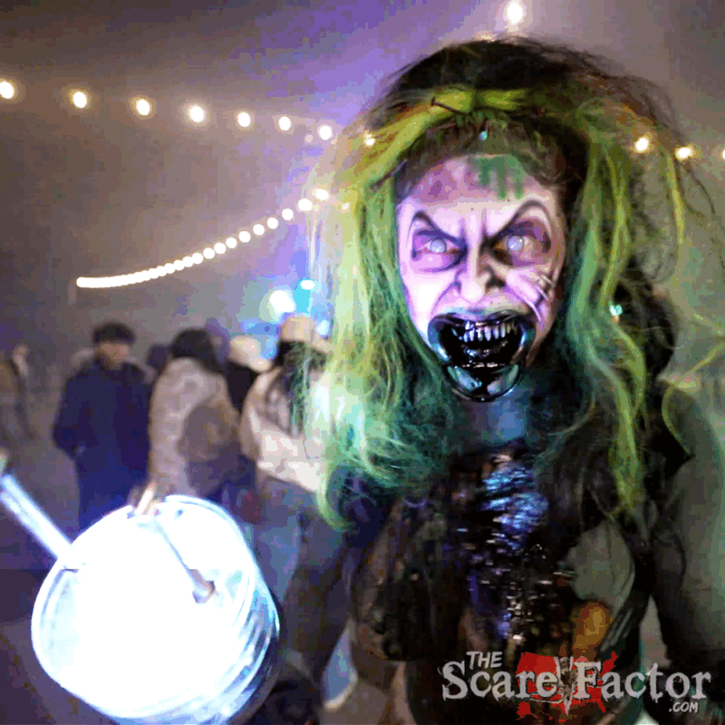New display monitors in the midway area near the ticket booth and gift shop familiarize visitors with many of the staple characters seen on the grounds, which was a very welcome feature. Variously placed props and animatronics playing creepy sounds and music in the midway invade the senses and support the eerie aura floating around. DJ Crankenstein kept the bass pumping and the intensity high. While warming up at the fire pit, characters easily spooked people as they warmed their fingers and toes. All of the food and drink vendors were in position for the actors to visit the lines and seating area, and they took full advantage of this!