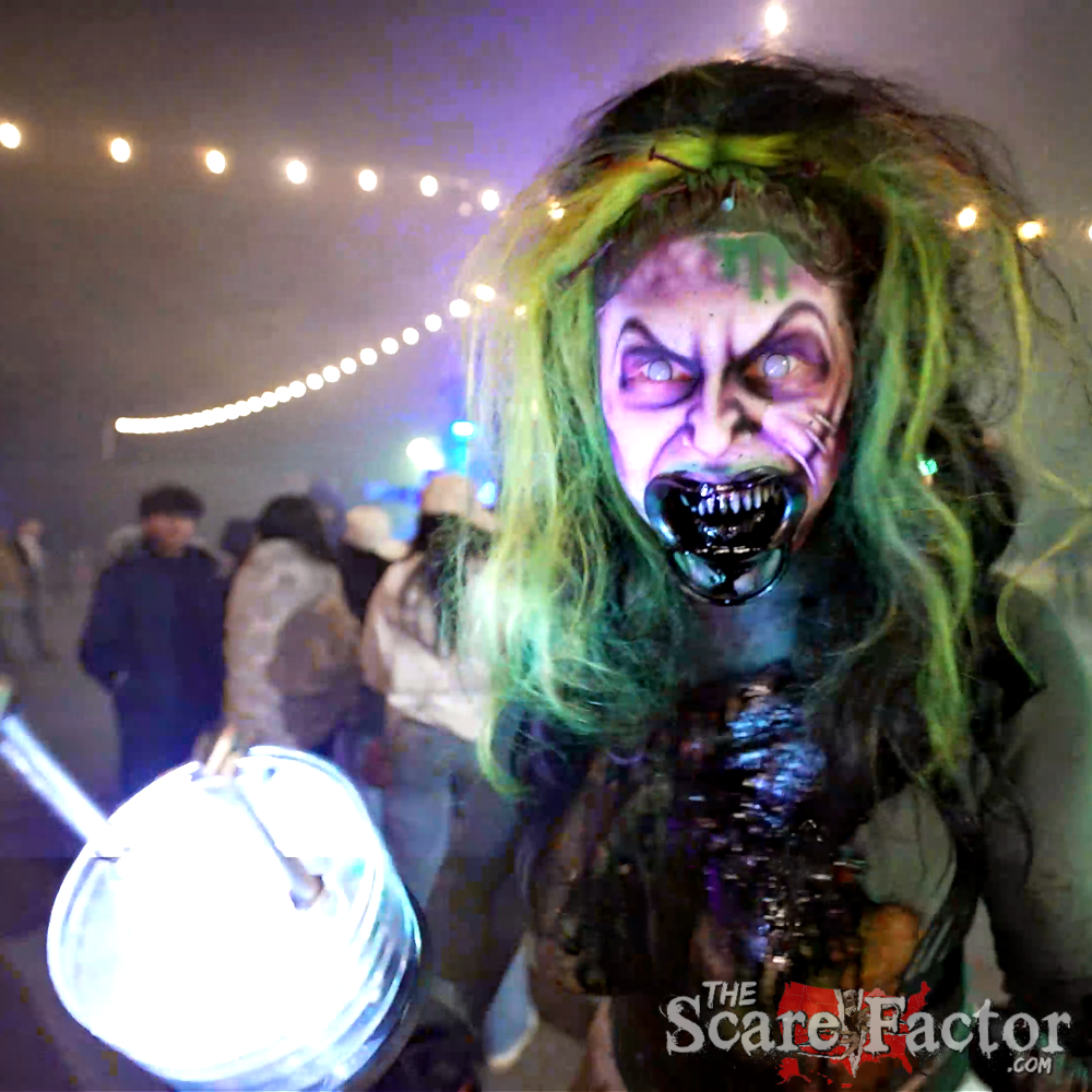 Before you even step foot inside, the scares begin. This place has some of the best queue-line actors we’ve seen anywhere – we watched several sliding clowns zip across the pavement, one wielding a chainsaw and another using a walker! Between their antics, you can enjoy the midway with DJ Crankenstein, tasty eats, and plenty of photo ops.
